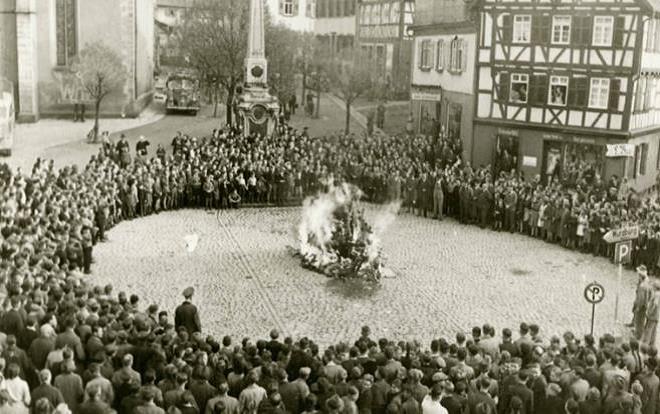 אבל ,הנאצים הם לא מחפשים את התלמידים והר"מים (רב מורה) ,הםמחפשים משהו אחר .הנאצים מגיעים לאוצר הספרים שבישיבה ואוספים משם את 22,000 ספרים,שהיו בסיפריה האדירה של הישיבה (הסיפריה התורנית הגדולה ביותרבאירופה) חלקם עתיקים וייחודיים .הרב מאיר שפירא, ראש הישיבה , (היהחובר ואספן ספרים ידוע)הגרמנים אספו את הכרכים הרבים הערימו אותם לערמה גדולה בכיכר מרכזיתבלובלין ,הזמינו את תזמורת מכבי האש המקומית ,וציוו על היהודים לעמודמסביב למדורה .האש מודלקת ,התזמורת מנגנת ,היהודים בוכים והנאצים הגרמנים צחוקיםבקול גדול .הספרים בערו מעל 20 שעות .מבינתם שריפת הספרים היא ניצחון הרוח .מבחינתנו "גווילין וספרים נשרפים ואותיות פורחות באוויר "וכך הנאצים כותבים בעיתון בגרמניה :"הייתה זו גאווה לנו להחריב את האקדמיה התלמודית הזאת, שהייתה נודעתכגדולה ביותר בפולין.השלכנו החוצה את כל הספרים הקדושים של היהודים והצתנו אותם. עשרים שעותשלמות השתוללו הלהבות.יהודי לובלין עמדו מסביב ובכו, אולם הוזמנה תזמורת צבאית והצלילים העליזיםשל המוזיקה החיילית החרישו את יללת היהודים".– ביטאון הנוער הגרמני "דויטשה יוגענד צייטונג "מה היה כול כך דחוף לנאצים לעשות את הפעולה הזאת? .למה הם שורפים ספרים בזמן שהמלחמה משתוללת ?ויש צורך להספיק ולכבוש את העולם.למה להשקיע זמן וכוח וכסף בשביל מעשה סימבולי ?ראו מה כותב איש משטרת הביטחון :"...יהדות לובלין היא מקור הכוח הגדול, הדומה למעיין לא אכזב, ממנו זורמיםיהודים לכל קצות תבל. מקור תחייתה של יהדות העולם. כך שמרה לובלין על קשרמתמיד עם יהדות העולם... כאן התקיימה במשך 200 שנה אסיפת הרבנים הידועהבשם "ועד 4 הארצות".מכיוון שלובלין הייתה נקודת המוקד והמרכז הארגוני של יהדות העולם וערכה שללובלין עלה עוד על ידי " ישיבת חכמי לובלין", הייתה לובלין מאוחדת תמיד עםיהדות העולם ולפיכך יכולה תמיד להפיץ את דעותיה ולהאציל מכוחה ההרסני עלכל היהדות כולה..." .-מתוך דו"ח איש משטרת הביטחון הרמן אריך זייפרטלרשות המינהל האזרחי של מחוז לובליןהגרמנים רואים בישיבת חכמי לובלין את "בית היוצר" של היהודי האידיאלי בעולםמקור תחיית היהדות -כאן "מייצרים יהודים" מכאן יוצא המוסר היהודי לעולםומרעיל אותו .ולכן חשוב מאוד, דבר ראשון , להגיע ל"אוצר הספרים" של הישיבה -כך קוראיםבעולם הישיבות לספריה התורנית -אוצר זה ,"האוצר שלנו"-כי אנחנו עם הספרוהספר הוא האוצר שלנו .מבחינת הנאצים האוצר הזה חשוב מעוד יהודי בדרךלמיידנק או אושוויץ כי המלחמה היא אידיאולוגית זו מלחמה של העם הנבחר גזעהאדונים נגד העם הנבחר נגד העם שמפיץ בעולם מוסר וערכים .כי ,כך הם כותבים :"...בתוך חורים, במערות, המחבואים מזוהמים הנסתרים של גטו לובלין נמצאערש היהדות. תת אנושות של גזע ממזרים יהודים השתלט ,על כל נפת לובלין..".- מתוך כתבי אחד התועמלנים הנאצייםצריך להבין מה הוא שורש המאבק בין הנאצים ליהודים ?מקור ושורש המלחמה הוא המאבק במוסר היהודי ,אנחנו ,היהודים, מבחינתםמפריעים לחוקי הג'ונגל לשלוט בעולם -חוק החזק שולט .(היהודים והיהדות מבחינת הנאצי ם הם "אונטר מענטש"-תתאדם Untermensch)כאן בישיבת חכמי לובלין "ייצרו את המוסר היהודי" לדברי הנאצים הגרמנים,"אוצר הספרים" שלנו הוא אוצר גדול ,בו טמונים הסודות של הערכים שלנו,המוסר שמפחיד כול כך את הנאצים .כשמגיעים לישיבת חכמי לובלין זוכרים את 9 שנות לימוד התורה בישיבה.זוכרים שמכאן יצאו מאות תלמידים והפכו לראשי ישיבות, אדמו"רים ,רבני ערים,אנשי עסקים, בני תורה . (בין בבוגרים יחיאל דינור-קצטניק, הרב וואזנר ועודועוד)ופרויקט לימוד ה"דף היומי" שנמשך עד היו ם בכול העולם היהודי .אך בעיקר זוכרים שהציווי שלנו הוא להמשיך את המוסר והערכים היהודיים .להילחם ברשע וברוע בעזרת המוסר היהודי .